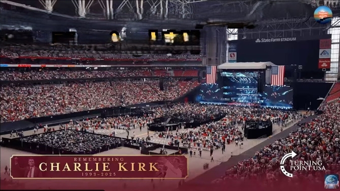 광장에 설치된 무대 위에는 ‘신앙 위에 선 자유, 그 불씨를 다시 켜라’라는 문구가 크게 걸려 있었고, 옆에는 찰리 커크의 사진과 저서 전시 공간이 마련되어 있었다. 참석자들은 검은 옷이나 단정한 복장을 갖춘 이들이 많았고, 일부는 촛불이나 횃불을 들고 와 ‘예배’라는 표현이 어울릴 만큼 장엄한 분위기를 연출했다.